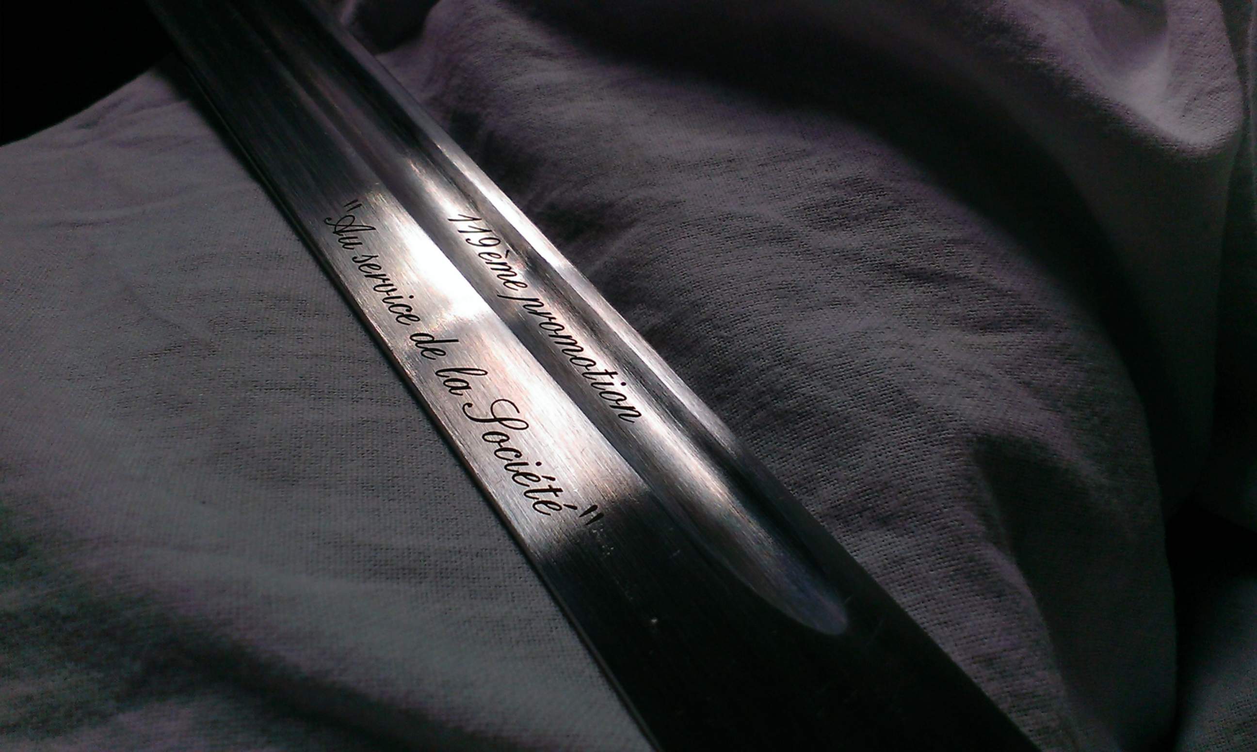 Mon sabre modèle 1923 est marqué d'un extrait de la Charte d'éthique de l'ingénieur : « L'ingénieur diffuse son savoir et transmet son expérience au service de la Société ».