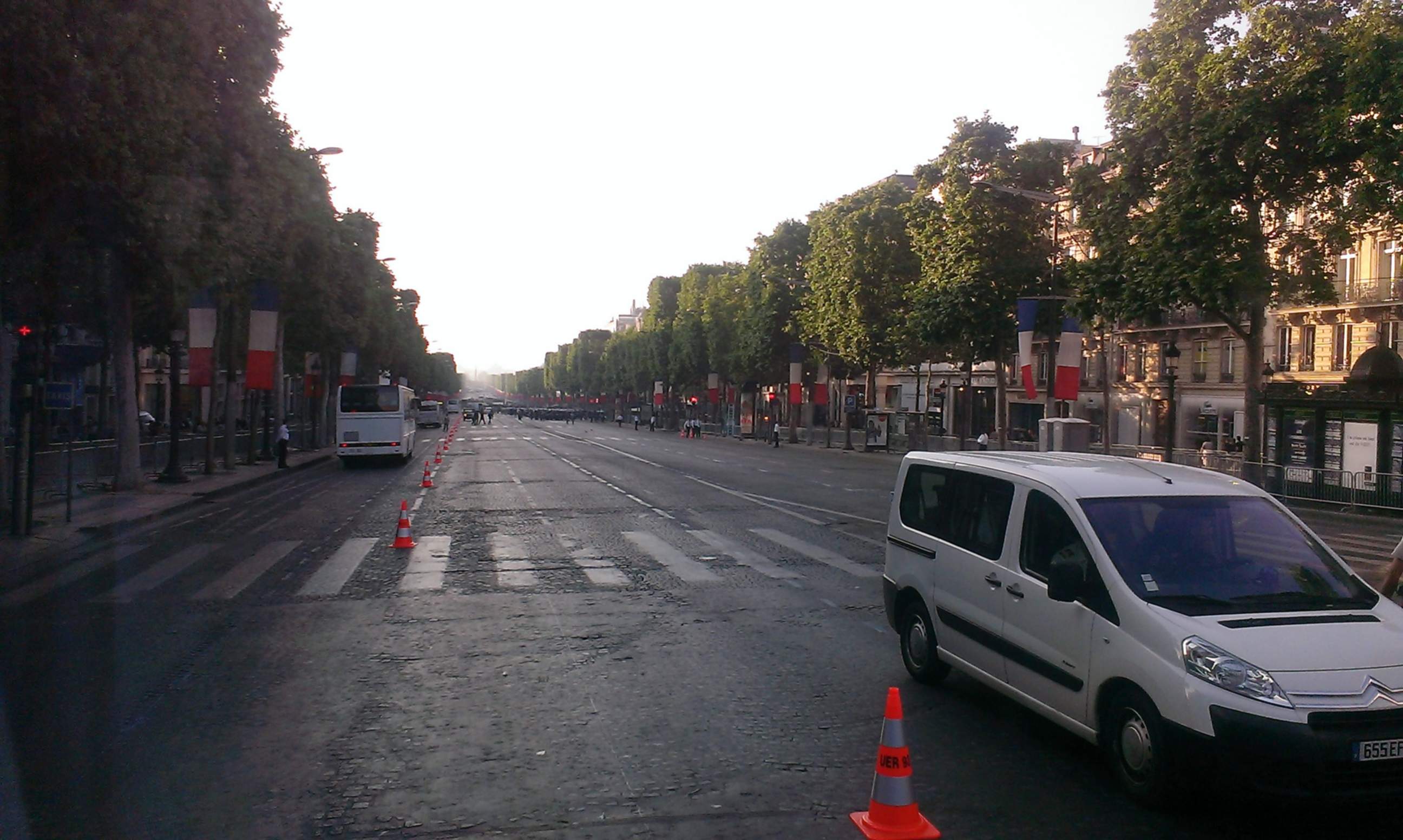 Mise en place sur les Champs. Le bloc à notre droite est l'École polytechnique (X).
