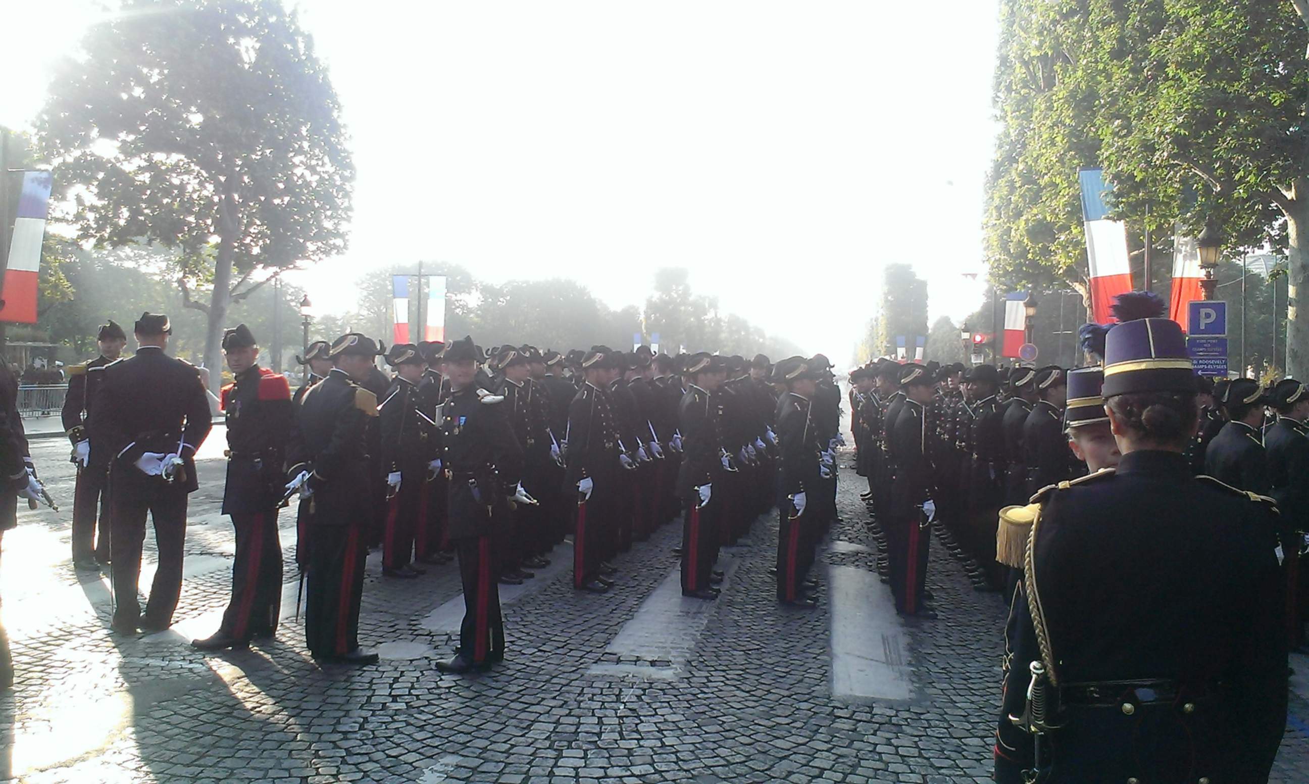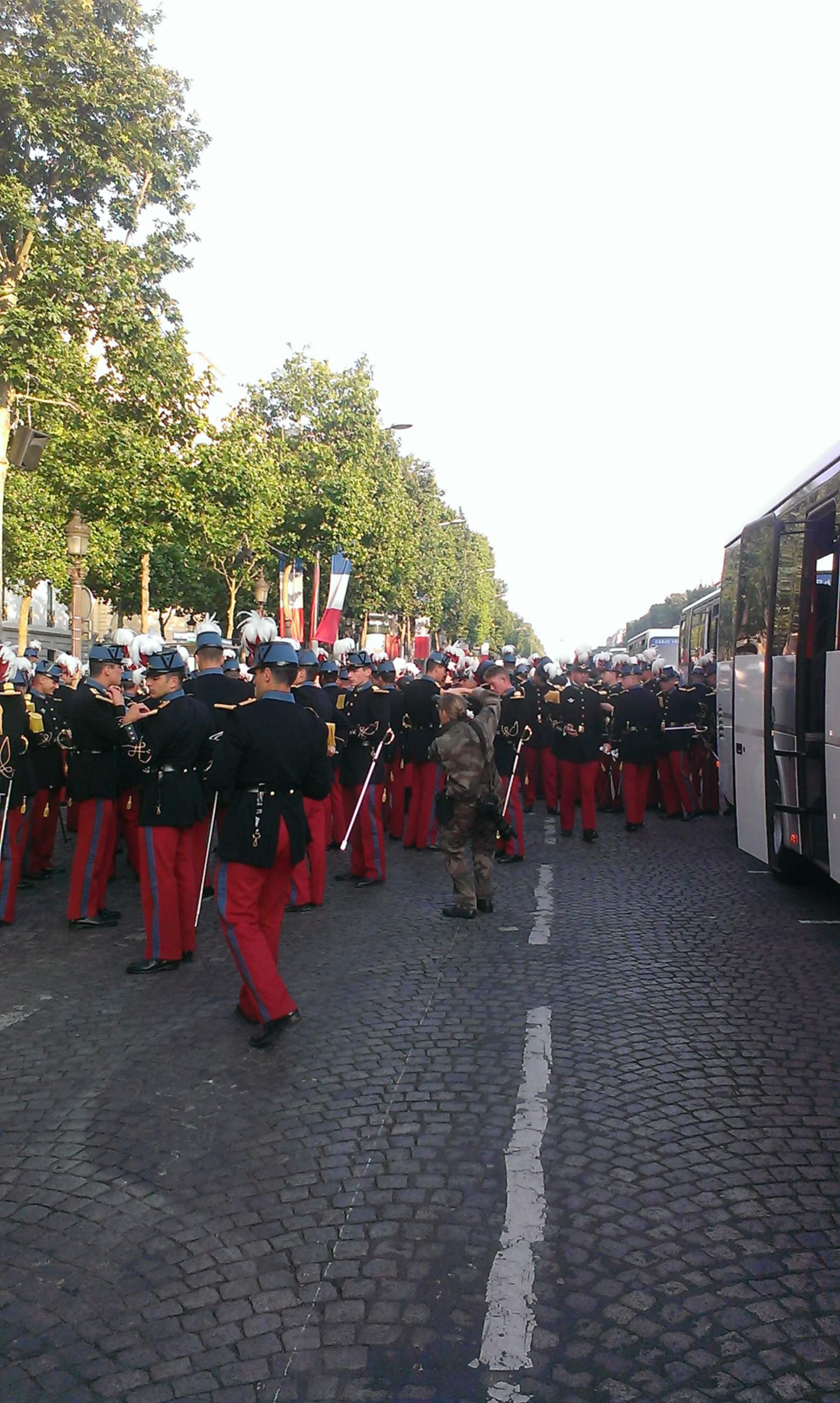 Mise en place sur les Champs. Le bloc à notre gauche est l'École spéciale militaire (ESM) de Saint-Cyr.